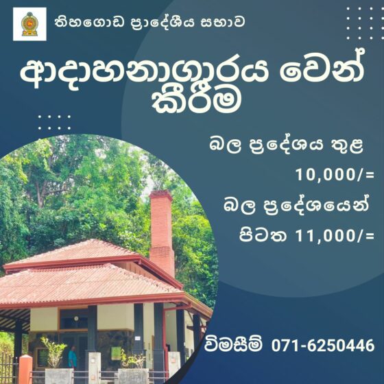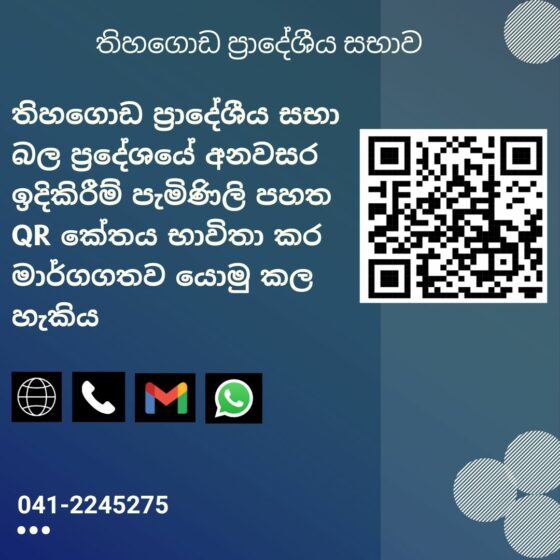 තිහගොඩ ප්රාදේශීය සභාව මඟින් සපයන සේවාවන් ලබා ගැනීමට කාර්යාලය වෙත පැමිණිම වෙනුවට e – තාක්ෂණය මගින් අවශ්ය සියළුම සේවාවන් තම නිවසේ සිට ලබා ගනිමින් ප්රාදේශීය සභාව ගමට ගෙන යන වැඩසටහන මේ වන විට ආරම්භ කර ඇත. ඒ තුලින් ජනතාවට ශ්රමය, ධනය හා කාලය ඉතිරි කර ගනිමින් ඉතා කඩිනමින් සේවාවන් ලබා දීමට තිහගොඩ ප්රාදේශීය සභාව ජනතාවට සමීතම රාජ්යය ආයතනය වශයෙන් අප, වර්තමාන හා අනාගත පරපුරට සරිලන ආකාරයෙන් තිරසාර ලෙස සෑම පැතිකඩකින්ම විශිෂ්ඨ තත්වයට පත්වීම සඳහා තිහගොඩ ප්රාදේශීය සභාව නියෝජනය කරන දේශපාලන නායකත්වය හා මා සමඟ මාගේ සමස්ථ කාර්ය මණ්ඩලය සෑම විටම කැප වී කටයුතු කරන බව සතුටින් ප්රකාශ කරමි.